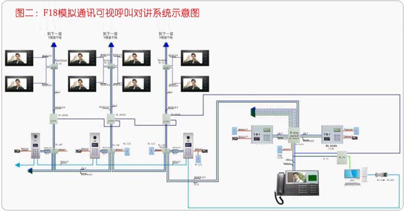 1. F18模擬通訊智能可視呼叫對講系統(tǒng)由室外門口機、室內(nèi)機、電源、分層器、聯(lián)網(wǎng)器、管理中心機等組成。