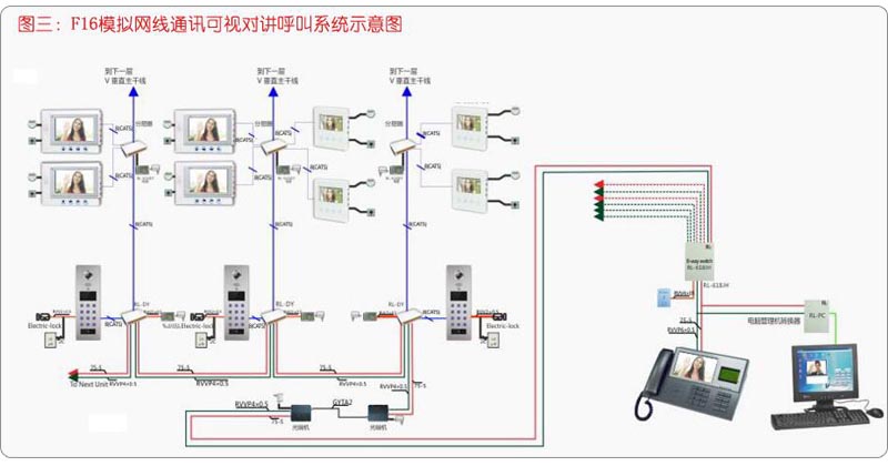 F16系列為模擬網(wǎng)線通訊模式,此種模式采用單片機控制技術、串行總線控制技術、音視頻差分傳輸技術等設計而成的,系統(tǒng)以管理中心為整個系統(tǒng)的管理和控制中心,通過系統(tǒng)聯(lián)網(wǎng)蔣各單元連接起來,實現(xiàn)呼叫、門鈴、對講、監(jiān)視、開鎖、聯(lián)網(wǎng)、報警、信息發(fā)布、門禁等功能。