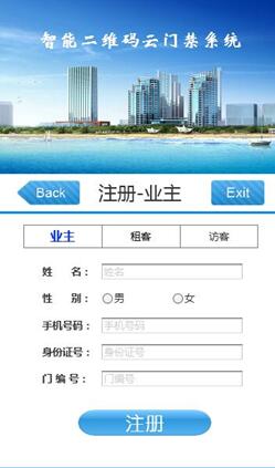 業(yè)主注冊(cè)需要輸入姓名,身份證號(hào)碼,手機(jī)號(hào)碼以及所屬的門編號(hào),門編號(hào)的格式要與門上的標(biāo)識(shí)完全一致。