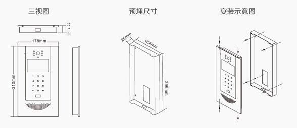 1. 顯示屏: 4.3TFTLCD彩屏 2. 分辨率: 480xRGB(H)x272(V) 3. 喇叭: 8Ω0.5W 4. 振鈴: 電子鈴聲不小于70db 5. 電源: DC12V/1A 6. 工作溫度: -20℃ ~ +60℃ 7. 待機(jī)功耗: 小于3.5W 8. 最大功耗: 小于4W 9. 產(chǎn)品尺寸: 310MM*178MM*33.7MM 10. 安裝尺寸: 296MM*164MM*25MM 11. 安裝方式: 壁掛式與嵌入式
