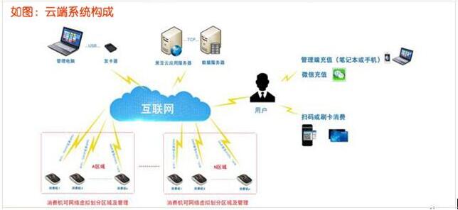 如圖五:廣域網(wǎng)BS架構二維碼刷卡機,WIFI版聯(lián)網(wǎng)售飯機:儲值、消費、積分、微信支付、掃碼支付、支付寶支付、手機客戶端查詢等,沒有地域性的限制。