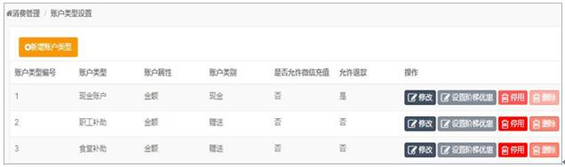 ■ 圖15、賬戶(hù)類(lèi)型設(shè)置,可以添加不同賬戶(hù)類(lèi)型,使不同的類(lèi)型具有不同作用,一般與消費(fèi)規(guī)則、單位補(bǔ)助、限制消費(fèi)、消費(fèi)優(yōu)先等消費(fèi)規(guī)定配套使用。