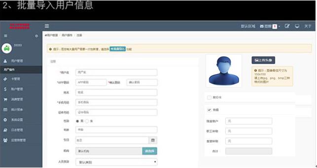 ■ 圖五:?jiǎn)T工信息批量錄入,即無(wú)卡即可開(kāi)戶(hù)。只需要導(dǎo)入智能卡卡內(nèi)嗎數(shù)據(jù)庫(kù)即可實(shí)現(xiàn)快捷錄入。也可以通過(guò)手機(jī)APP直接掃描二維碼綁定手機(jī)號(hào)與卡號(hào)實(shí)現(xiàn)快捷注冊(cè)。